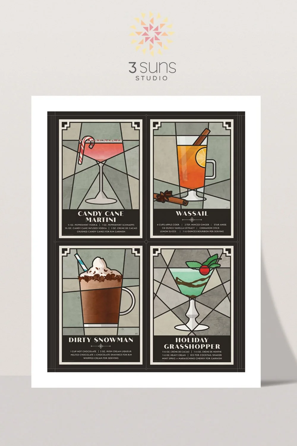 This version of the Holiday Cocktail Poster features 4 seasonal and colorful cocktails - Candy Cane Martini, Wassail, Dirty Snowman and Holiday Grasshopper. A perfect cocktail poster for anyone who is looking to get in the holiday spirit!